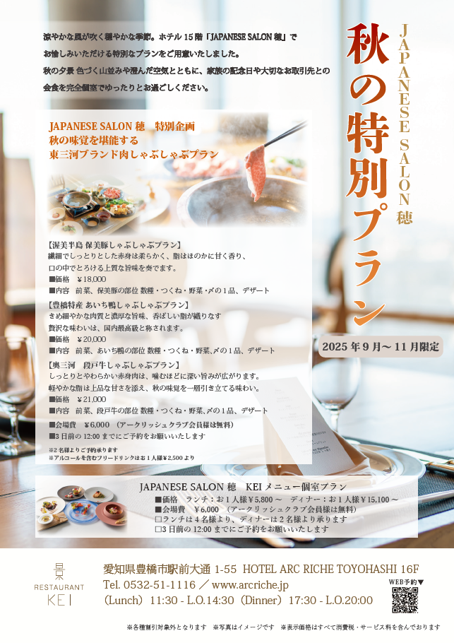 【特別企画】JAPANESE SALON 穂 特別企画 “秋の味覚を堪能する、東三河ブランド肉しゃぶしゃぶプラン”@ホテルアークリッシュ豊橋